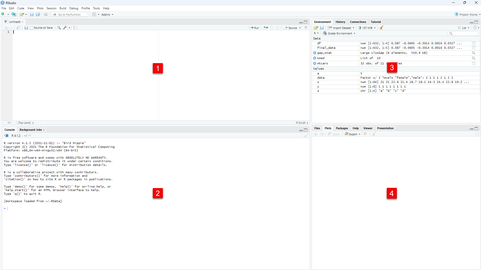 Pada dasarnya layout R Studio terdiri dari 4 bagian yaitu