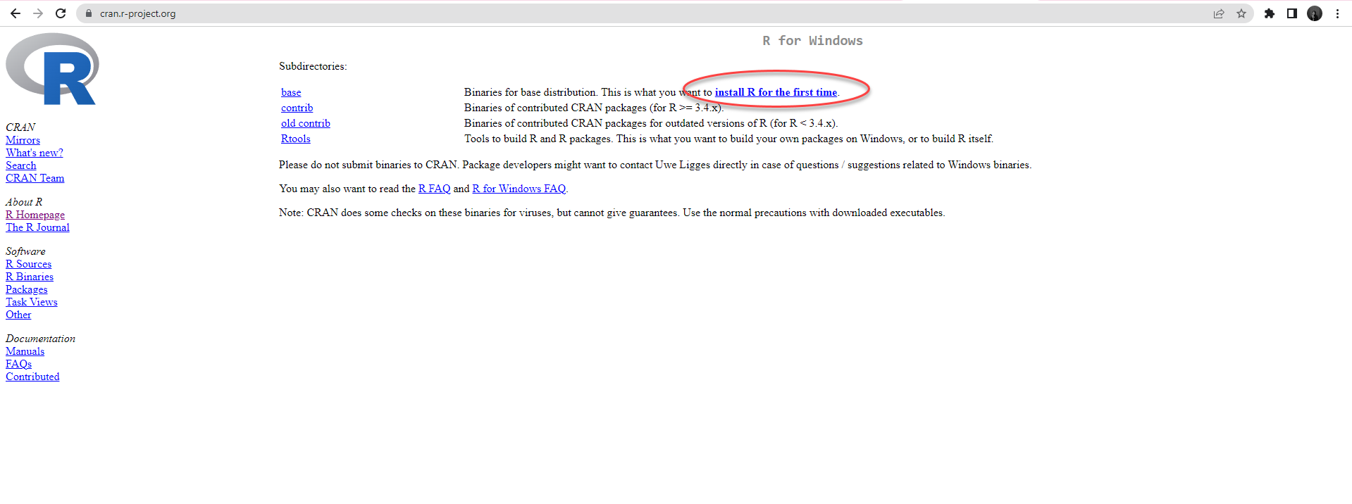Pilih installer sesuai dengan sistem yang Anda punya. Selanjutnya pilih install R for the first time.