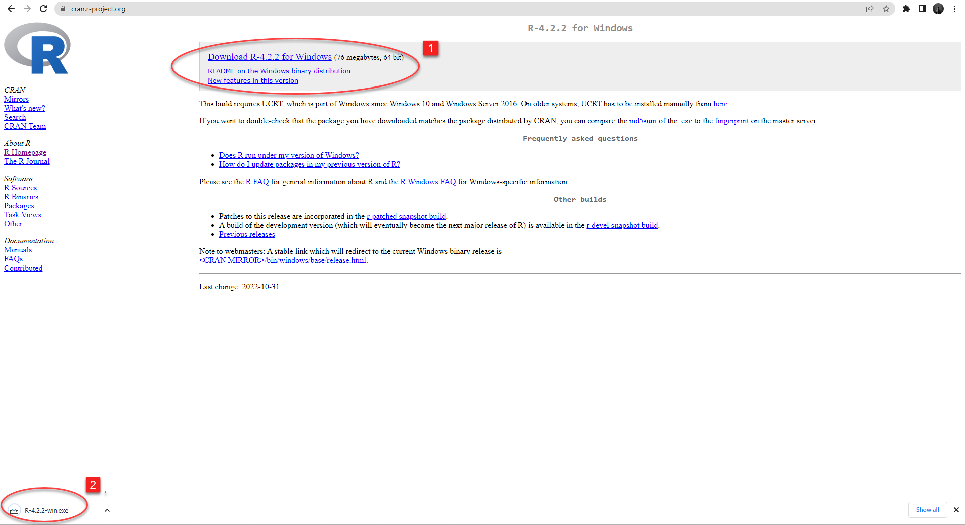 Selanjutnya download versi R terbaru (saat ini R berada di versi 4.2.2), klik link seperti pada step 1 dan tunggu proses unduh instaler hingga proses pengunduhan selesai seperti pada langkah 2.