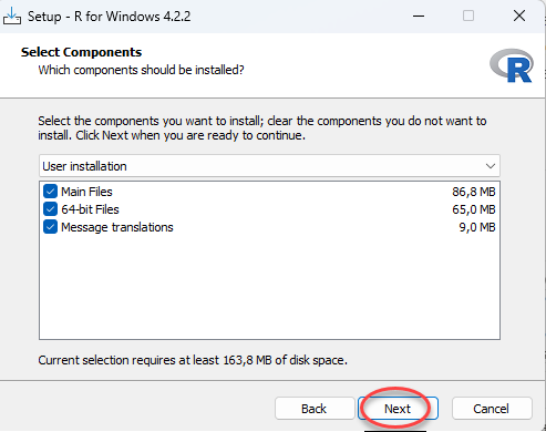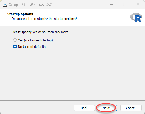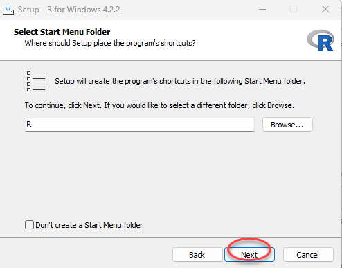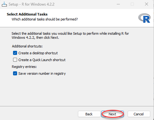 Kemudian biarkan default untuk membuat R dan pilih Next. Setelah itu, pada biarkan default Select Additional Task dan pilih Next.