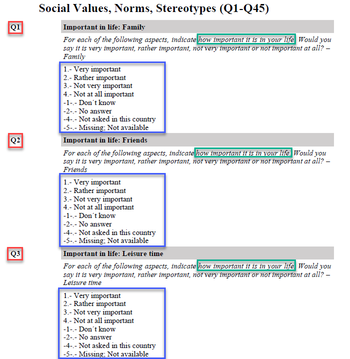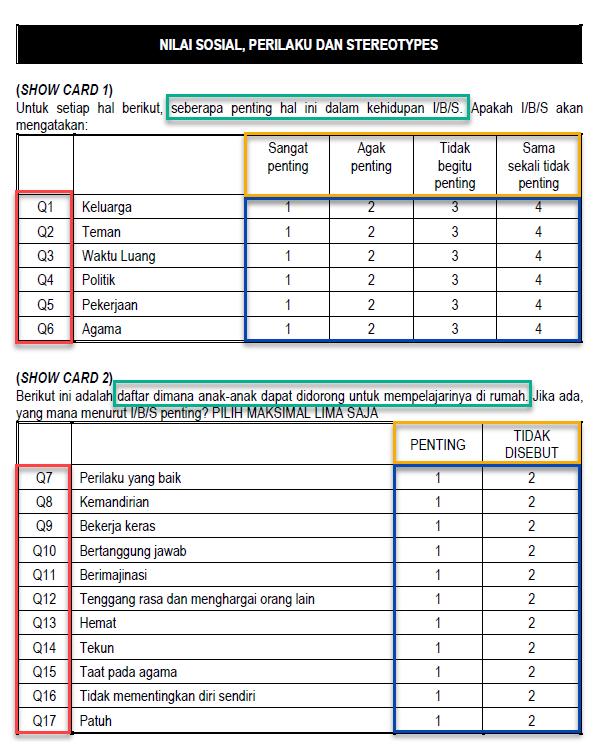 Gambar diatas merupakan contoh kuisioner data WVS Indonesia putaran ke-7 dengan kotak warna hijau menunjukkan item pertanyaan kuisioner, kotak warna merah merupakan kode pertanyaan, warna kuning dan biru merupakan skala pertanyaan penelitian.
