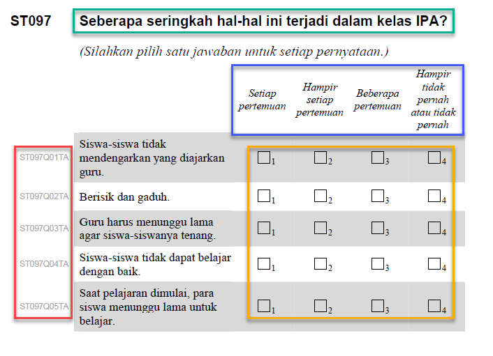 Gambar diatas merupakan contoh kuisioner data PISA 2015 dengan kotak warna hijau menunjukkan pertanyaan kuisioner, kotak warna merah merupakan kode pertanyaan, warna kuning dan biru merupakan skala pertanyaan penelitian.