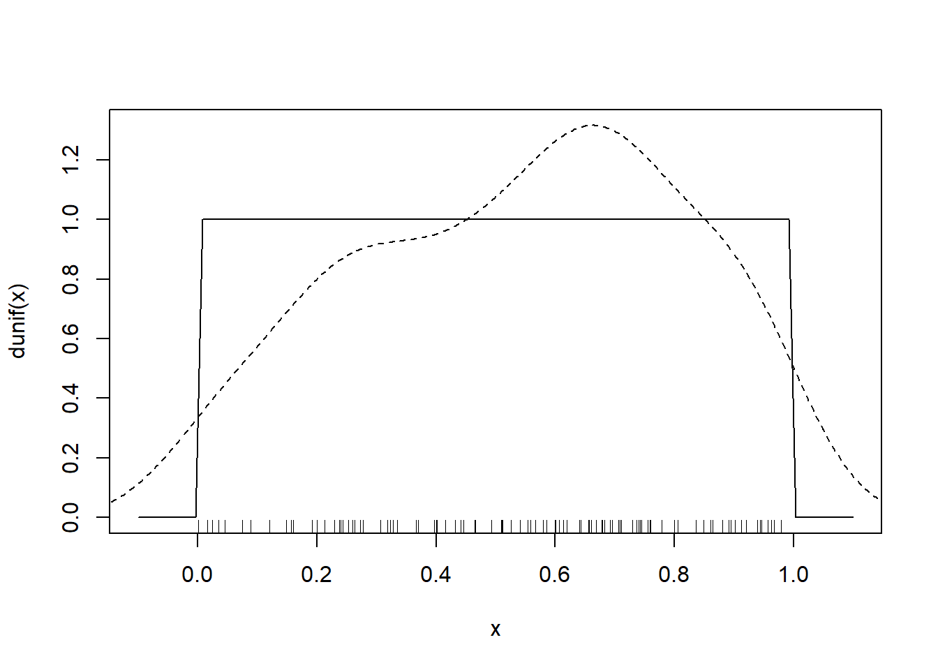 Gambar di bawah menunjukkan fungsi “d” untuk distribusi uniform dan estimasi kepadatan sampel acak dihasilkan oleh fungsi “r”.