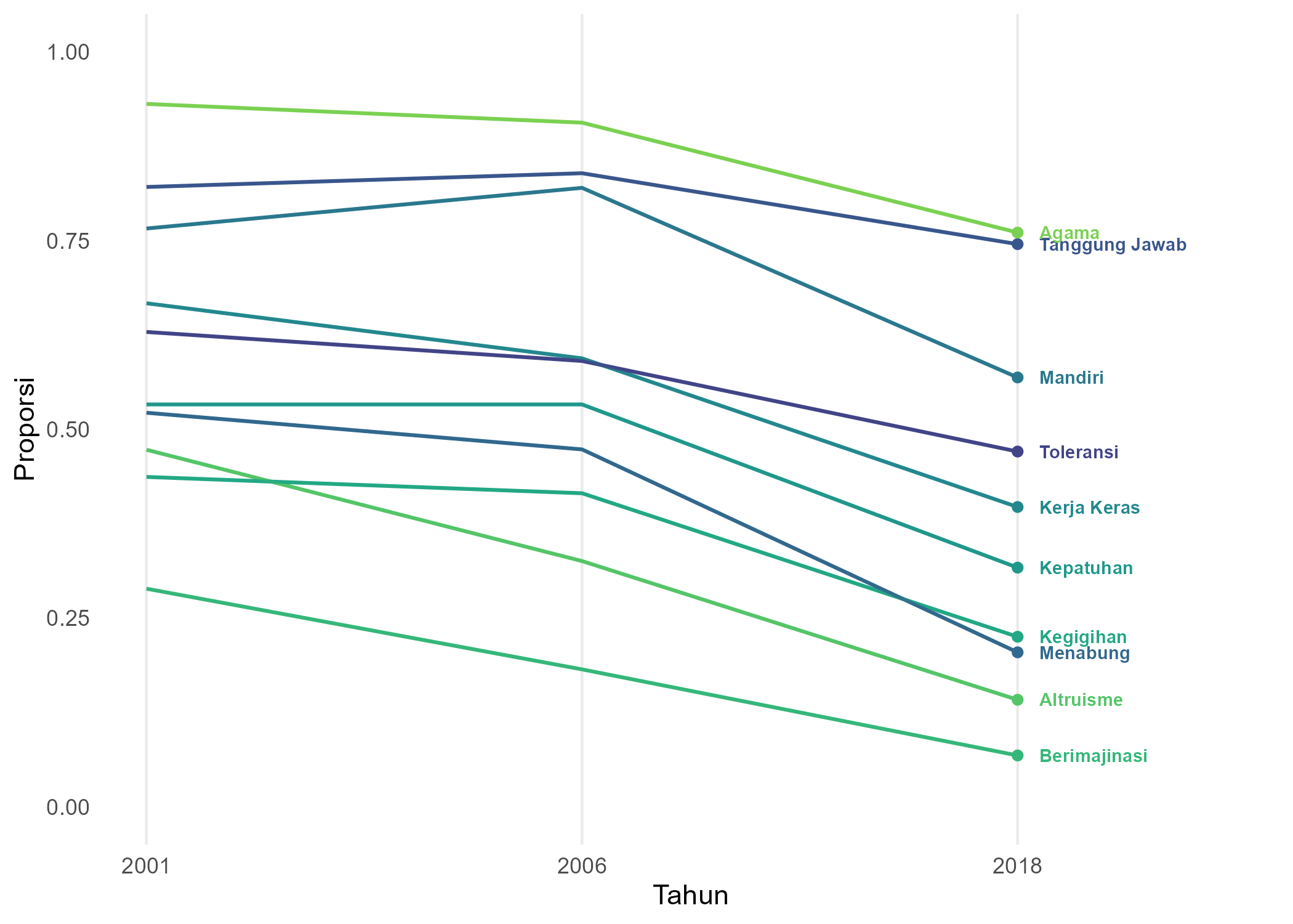 Berikut adalah visualisasi dari nilai-nilai yang diajarkan orang tua kepada anak mereka. Data tersebut merupakan data masyarakat Indonesia dan berasal dari World Values Survey (WVS). Agama menjadi nilai yang dianggap paling penting untuk diajarkan kepada anak, sedangkan berimajinasi menjadi nilai yang dianggap kurang penting.